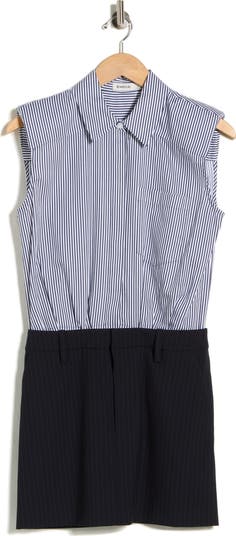 Get a layered look with this mixed-media dress featuring a sleeveless button-up shirt attached to a solid miniskirt.