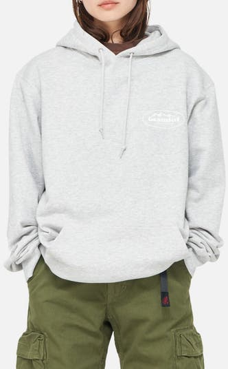 This relaxed-fit French Terry hoodie features ribbed trims, a kangaroo pocket and Gramicci’s logo with a mountain range graphic for adventure-ready style.