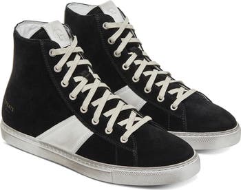 A unique distressed finish brings perfect retro flair to a leather high-top sneaker that combines Italian craftsmanship with classic sneaker culture.