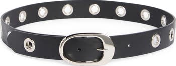 An oval buckle and grommets add an edgy finish to this faux leather belt that elevates any chic look.