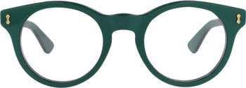 Subtly branded logo-engraved temples add understated style to these round optical frames with prescription-ready lenses.