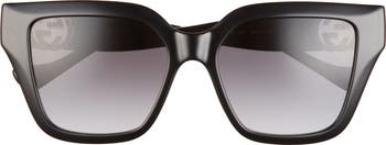 Sharply squared sunglasses with flared corners offer recognizable branding with iconic logos on their wide, sturdy temples.