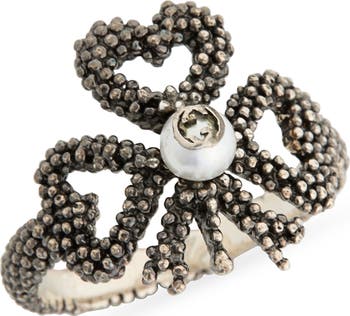 A faux-pearl inlaid with an Interlocking-G logo centers the beaded clover of this statement ring that's made in Itlay from sterling silver given an antiqued look with Gucci's Aureco finish.