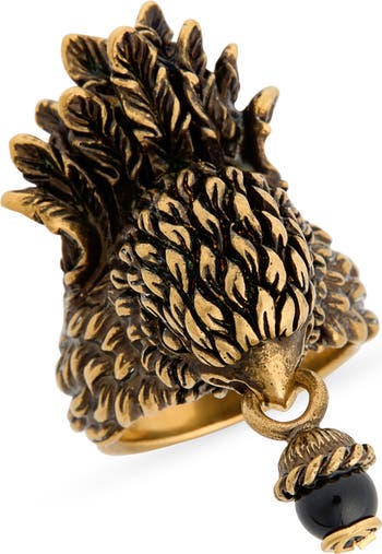 From the animal-themed house codes, a bird head ring detailed in antiqued goldtone plate and featuring a black faux pearl in its beak makes a statement delicately perched atop your hand.