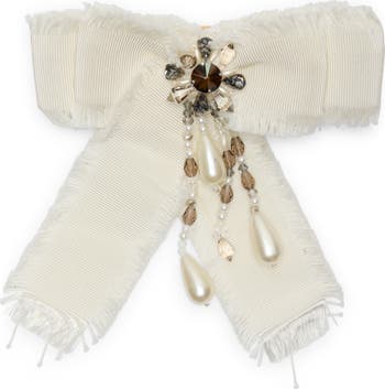 Complete your ensembles with a lovely touch using this frayed‑bow pin centered with a crystal cluster that suspends strands of faux pearls.