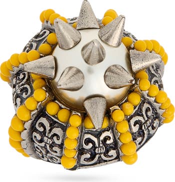 Bring a bit of edge to your looks with this cocktail ring adorned with intricate designs, bright yellow beads and a spiky glass pearl at the center.