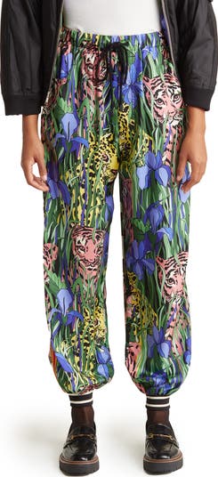 Tigers and leopards await upon these comfy floral joggers for a wildlife-like look.