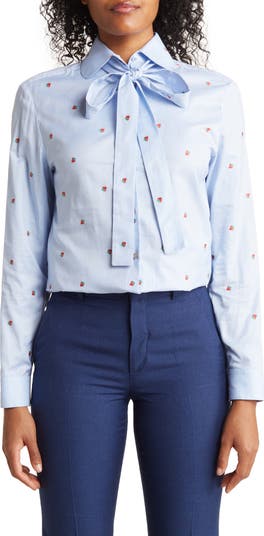 Embroidered strawberries sweeten this breathable, pure-cotton shirt framed by a tie neckline and long sleeves.