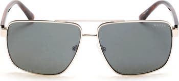 Tortoiseshell temples defined by 'G' logo hardware frame everyday sunglasses centered by rectangular lenses.