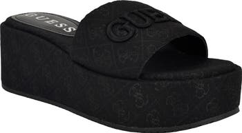 A signature embossed allover logo print makes a statement on this weekend-ready slide sandal lofted by a chunky platform and integrated wedge heel.