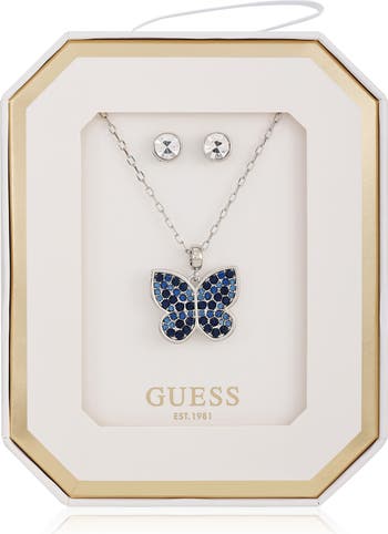 Bring a dose of whimsy to your look with a butterfly pendant necklace paired with coordinating stud earrings complete with the brand's logo.