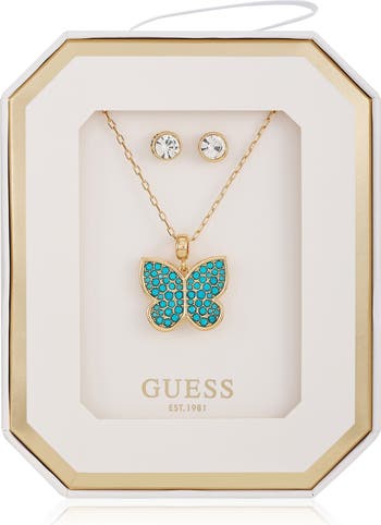 Bring a dose of whimsy to your look with a butterfly pendant necklace paired with coordinating stud earrings complete with the brand's logo.