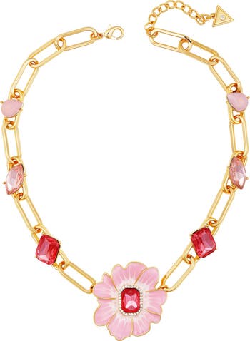 Paper-clip links lend modern appeal to a polished chain necklace centered by a flower-shaped pendant and adorned with glitzy crystals.