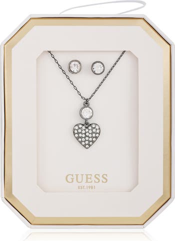 Sparkling crystals enhance the romance of this heart pendant necklace that pairs perfectly with round stud earrings in this giftable set.