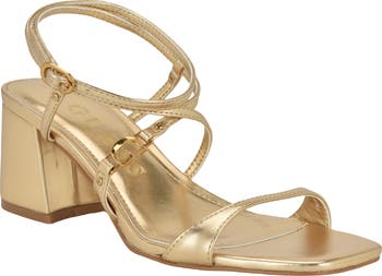 - Adjustable ankle strap with buckle closure; hidden elastic inset