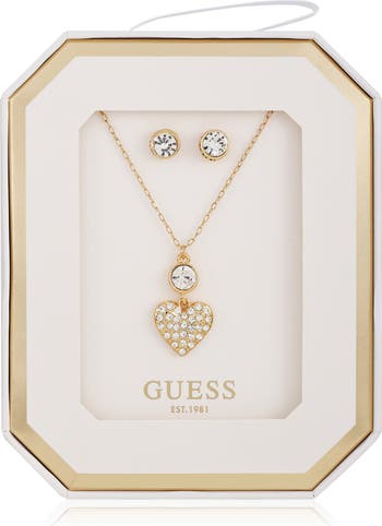 The brand's logo is etched into the crystal stud earrings in this set complete with a delicate chain necklace centered by a heart-shaped pendant.