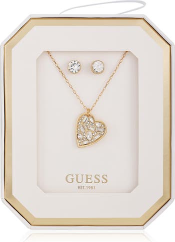 The brand's logo is etched into the crystal stud earrings in this set complete with a delicate chain necklace centered by a heart-shaped pendant.