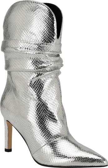 This scrunched bootie set on a stiletto heel mixes glam and Western influences with a metallic snake-embossed finish and a curved topline.