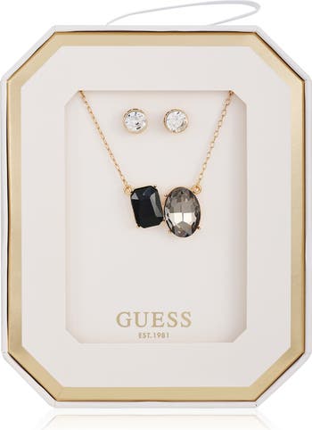 Branded stud earrings are paired with a crystal pendant necklace in this glamorous set that delivers a dose of shine to casual or elevated looks.