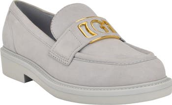 Easily go from desk to dinner in this suede loafer featuring a cutout logo on the vamp strap and lifted by a low block heel.