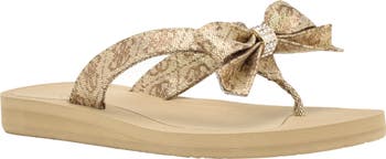 Jewel-encrusted hardware and a voluminous vamp bow stands out on a glamorous flip flop secured by a center toe post.