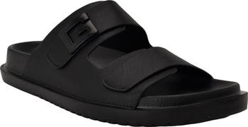 Engraved hardware logo brands this sporty slide sandal that sits atop a slightly lifted sole that's contoured to your foot.