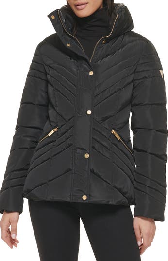 Stay warm in this water-resistant puffer jacket constructed with a cozy stand collar, chevron quilting and secure zip pockets.