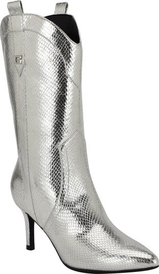 Snakeskin-embossed faux leather underscores the Southwestern influence of a trend-right boot with side pull-tabs and a pointed toe.