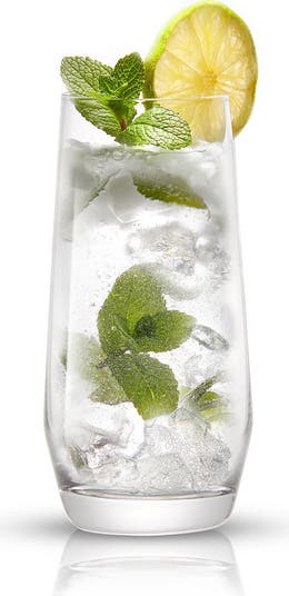 A set of four highball glasses crafted from lead-free crystal are inspired by the shape of a lava lamp for sophistication at your personal happy hour.