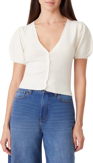 Delicate pointelle stitching brings airy charm to this cropped V-neck cardi framed by delightful puff sleeves.