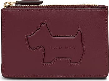 An embossed Scottie dog traced in tonal topstitching puts a brand-signature touch on this compact card case made from water-resistant calfskin leather.