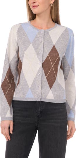 An argyle pattern lends luxe sophisticated to a wool-kissed cardigan that looks great on its own or can be layered over existing wardrobe favorites.