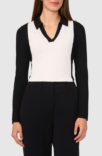 Opt for a sporty look in this stretchy and lightweight jersey top featuring a high-contrast colorblock and a johnny collar.