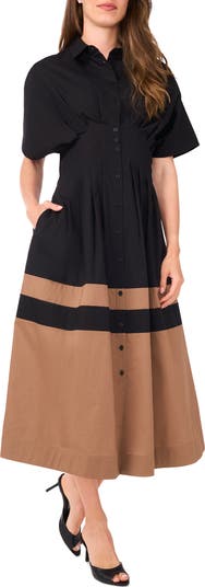 Crisp pleating along the bodice and radiating from the waist shapes the silhouette of this colorblocked cotton-poplin midi complete with a full A-line skirt inspired by classic '50s styles.