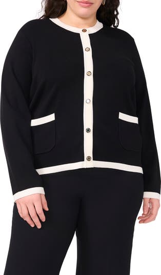Contrasting trim frames this polished cardi designed with decorative welt pockets and shiny goldtone hardware.