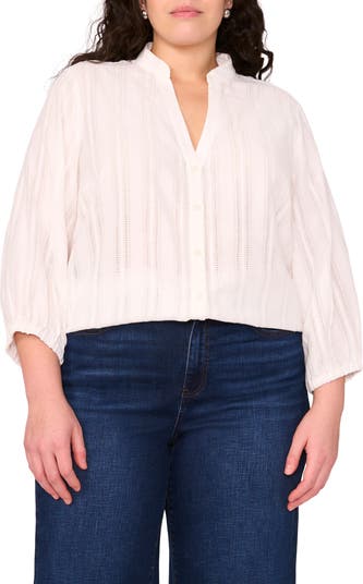Lacy insets add to the breezy vibes of this all-cotton button-up top framed by billowy three-quarter sleeves and perfect for elevated warm-weather looks.