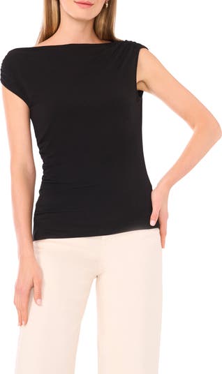 Refresh your essentials with this solid sleeveless top fashioned in a figure-skimming silhouette framed by asymmetric ruching.