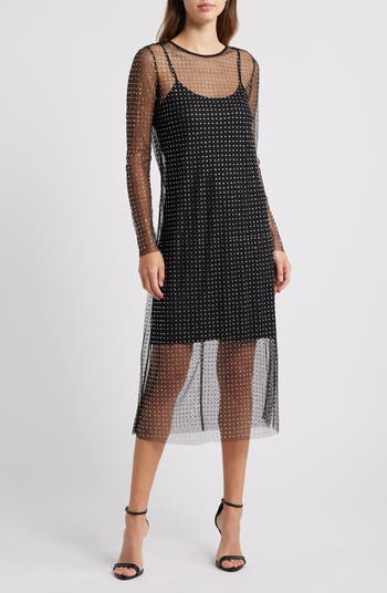 Be the topic of cocktail chatter in a mesh dress dappled with dazzle and sure to get glasses raised.