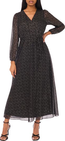 Metallic dots pepper this charming faux-wrap chiffon maxi dress framed by gently puffed sleeves and a removable tie belt.