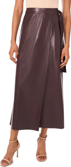 Show off chic style in this smooth faux-leather skirt fashioned in a graceful wrap silhouette.