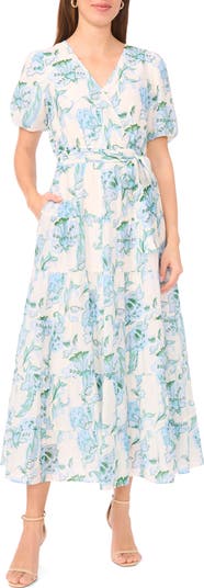 A charming floral print adorns this pretty puff-sleeve maxi dress fashioned with a removable tie belt and gracefully tiered skirt.