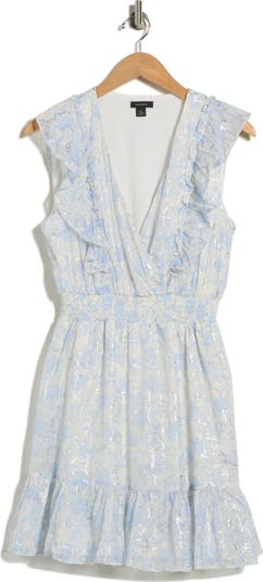 A metallic floral print enhances the whimsical charm of this sleeveless minidress framed by fluttery ruffles and a godet-inset skirt.