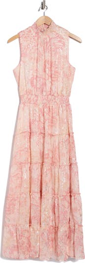 Metallic threads bring subtle sheen to this flowy maxi dress fashioned with a smocked waist and tiered ruffles.