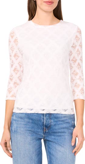 Ornate lace romances this day-to-date-night top designed with a classic crewneck and sheer three-quarter sleeves.