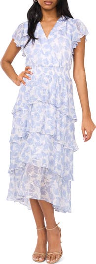 A simmer of shimmer swirls through a batch of pretty blooms to define a winsome dress that's ready for summery garden parties.