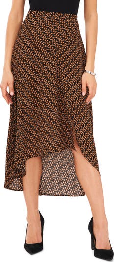 A front slit, diagonal piecing and high-low hemline offer breezy appeal to this skirt cut with a high waist.