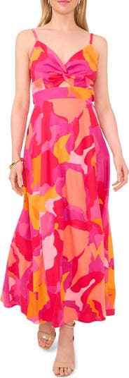 Cutouts under the bust and at the back add breezy style to this linen-kissed sundress covered in a bold print and ready to add some glam to your vacation wardrobe.