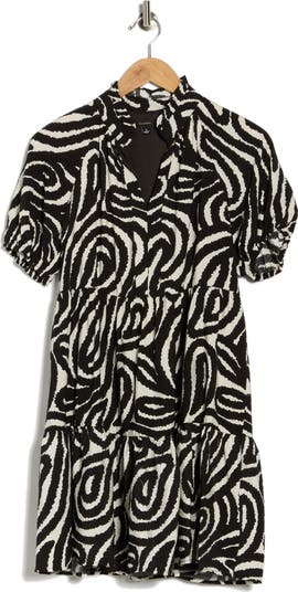 Mesmerizing circles further the contemporary styling of this tiered dress framed with puff sleeves.