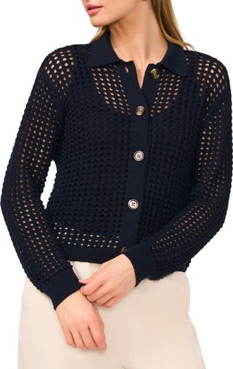 This chic, collared cardigan featuring an open-weave design and tortoise-patterned buttons looks great solo or layered.