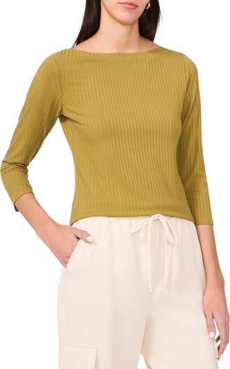 A boat neck and three-quarter sleeves make this ribbed knit top a chic go-to for effortless style.